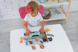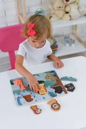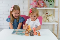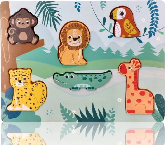Drveni 3D puzzle Safari Životinje idealna su igračka za djecu od 12 mjeseci. Pomažu razvijati kognitivne vještine tako što djeca slažu različite oblike životinja u pripadajuće izreze.