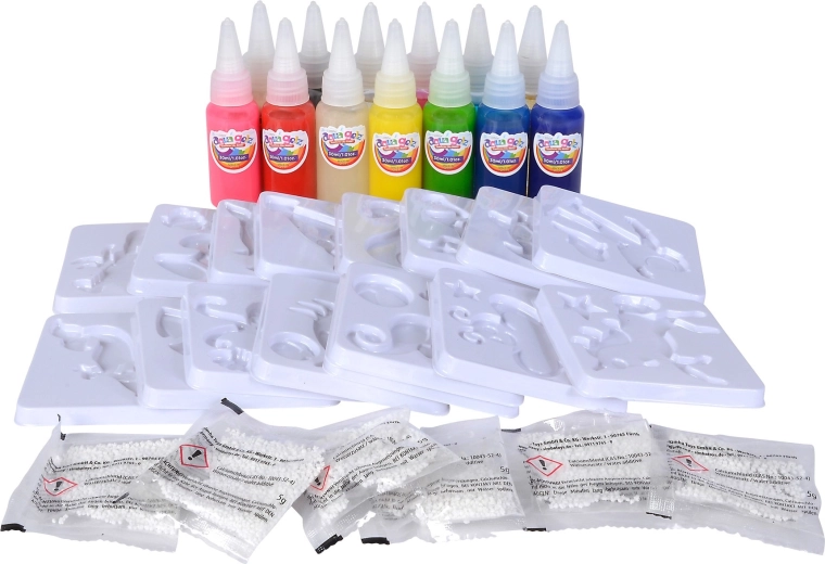 Uz veliki kreativni set Aqua Gelz djeca lako stvaraju vlastite šarene figurice i dekoracije. Postupak je jednostavan: razmutite prašak u posudi s vodom, odaberite motiv, ispunite kalup obojenim gelovima i nježno uronite – za nekoliko sekundi nastaje plastična 3D figurica koja sama ispliva iz kalupa.