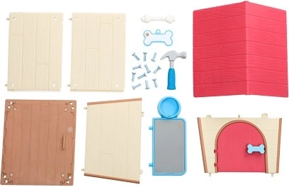 Set idealan za malog ili spretnog majstora. Složite kućicu od priloženih dijelova, ulijte vodu u zdjelicu, dajte psiću ime i pribijte pločicu s imenom na vrata kućice...