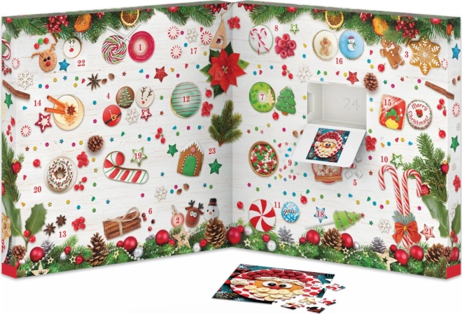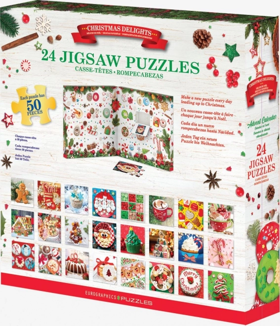 Ovaj adventski kalendar EUROGRAPHICS donosi radost u svaki prosinački dan. U 24 prozorčića nalazi se 24 različitih puzzli, svaka s 50 dijelova i prekrasnim božićnim motivom. Sličice su kvadratne i nakon slaganja imaju dimenzije cca 12,5 × 12,5 cm. U svakom prozorčiću priložen je i predložak za lakše slaganje, a na poleđini pakiranja nalazi se pregled svih motiva.