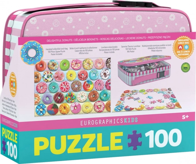 Šarena dječja slagalica s motivom ukusnih krafni u originalnom poklon-pakiranju – termo kutija za užinu s patentnim zatvaračem. Idealno kao praktičan i zabavan poklon, sadrži 100 dijelova, priložen je plakat/predložak, a nakon slaganja dimenzije su oko 48 × 33 cm.