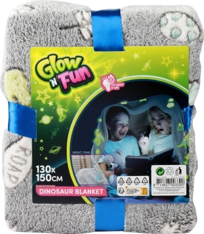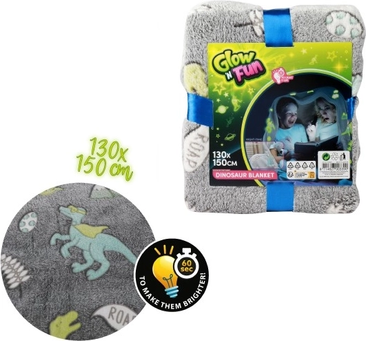 Meka i topla deka s uzorkom dinosaura koji u mraku zaista svijetle. Dovoljno ju je kratko izložiti svjetlu i uživat ćete u čarobnom noćnom efektu, ugodnom plišanom materijalu i praktičnoj dimenziji 130 × 150 cm za odmor kod kuće i na putu.