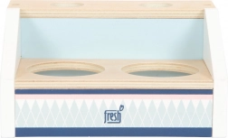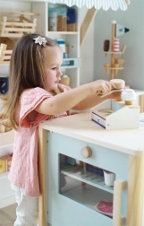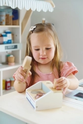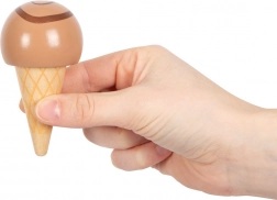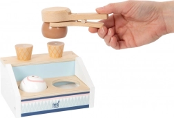 Drveni pult za sladoled SMALL FOOT Fresh donosi u dječju kuhinju savršeno slatku zabavu. Dva pretinca, korneti i kuglice zahvaljujući magnetima lako se slažu i drže, pa djeca mogu posluživati sladoled kao u pravoj slastičarnici. Magnetska žlica omogućuje jednim pritiskom „staviti“ kuglicu na kornet – jednostavno, zabavno i vrlo efektno.
