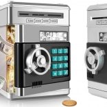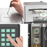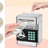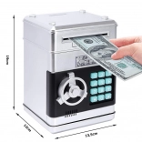 Ovaj elektronički trezor izgleda kao pravi trezor i idealan je za čuvanje kovanica i novčanica. S kodnom bravom i svjetlosnim indikatorima, ne samo da je koristan pomagač već je i sjajna zabava za djecu. Trezor je opremljen mjestom za umetanje kovanica i novčanica te ima tipke s pozadinskim osvjetljenjem.
