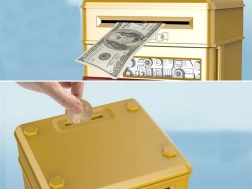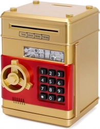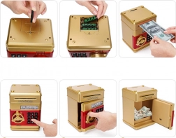 Izrađena je od izdržljivog plastičnog materijala u zlatnoj boji. Ova kasica omogućava jednostavno umetanje kovanica i novčanica, a tu je i mogućnost postavljanja pin koda do 4 znamenke.