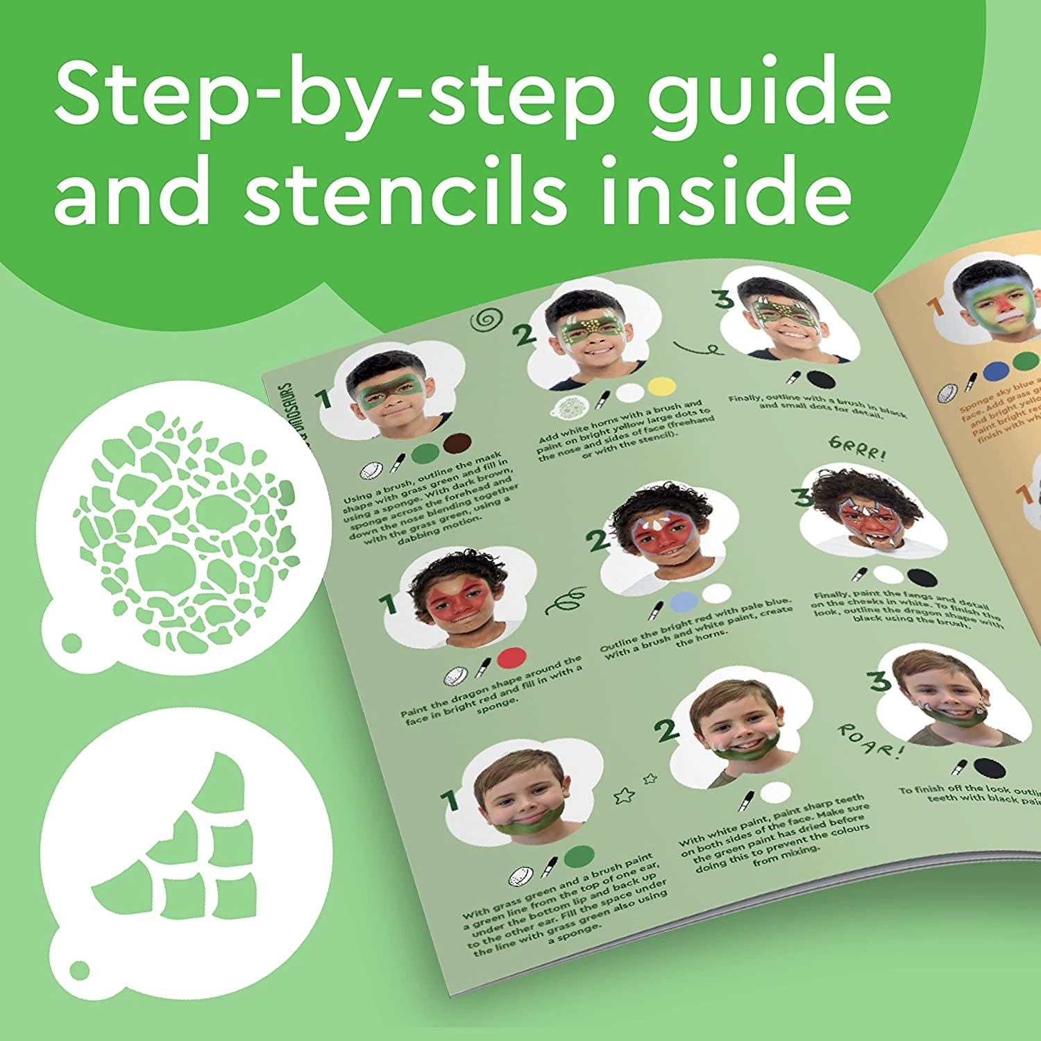 Ukrasite lice i tijelo bojama! Sjajna zabava za vas i vaše prijatelje. Zahvaljujući posebnim bojama za kožu i šablonama možete na lice nacrtati ornamente ili, primjerice, brkove i bradicu. Prednosti: - jednostavne za uporabu - sigurne - netoksične - lako se uklanjaju Sadržaj pakiranja 13 kom: osam različitih boja po 2 ml, spužvica, kist, šablone i slikovni priručnik. S bojama možete oslikati do 40 lica. Upute za uporabu: Budite kreativni s nekim od naših jednostavnih uputa i šablona ili osmislite vlastite ideje! Navlažite spužvicu i/ili kist s malo vode. Nanesite malo boje. Kad vaše dijete završi s pustolovinom, dovoljno je isprati vodom i sapunom. Koristite pod nadzorom odraslih. Upozorenje: Proizvod može izazvati alergijsku reakciju. Najprije isprobajte boju na malom dijelu kože. Nije prikladno za djecu mlađu od 3 godine.