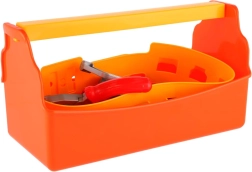 Narančasta plastična kutija s čvrstom žutom ručkom i unutarnjom pregradom drži sve alate pregledno na jednom mjestu, a djeca je lako prenose.