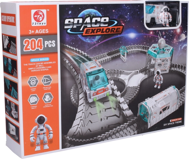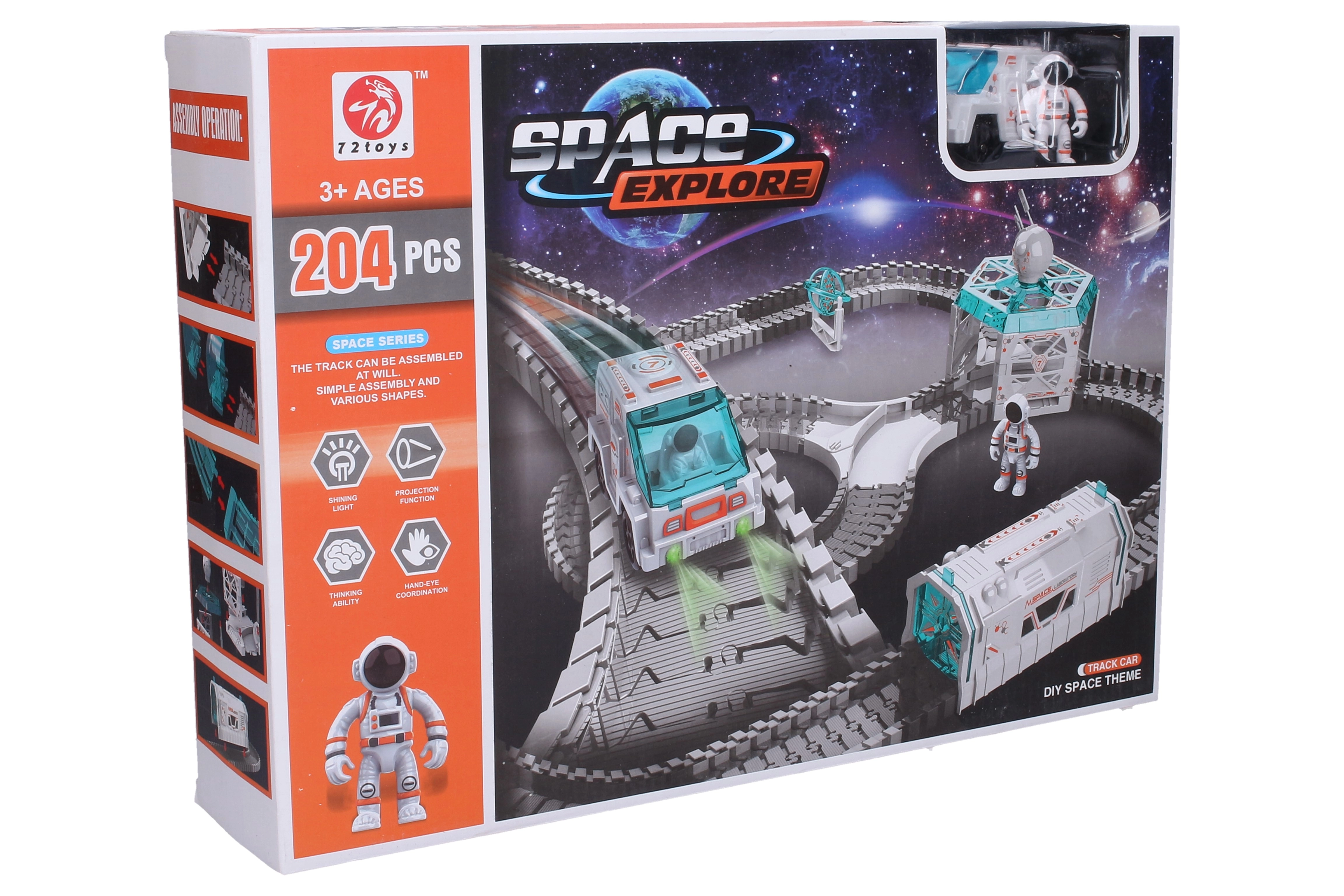 Ova velika svemirska staza donosi djeci sate kreativne zabave. Zahvaljujući funkcionalnom projektoru sa svjetlosnim efektima svaka vožnja oživi, a dodaci poput automobila i astronauta potiču maštu i igru uloga. Jasan slikovni priručnik na ambalaži olakšava brzu i jednostavnu montažu.