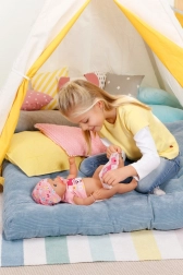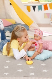 Lutka BABY born djevojčica s čarobnom dudu idealan je suputnik za svakodnevnu igru i vježbanje brige o bebi. Okretanjem dude otvara ili zatvara oči, i to u sjedećem položaju – bez obzira na položaj tijela. Kada je položite na leđa bez dude, oči se automatski zatvore. Mekano tijelo Soft Touch i lako pokretne ruke, noge i glava olakšavaju presvlačenje i daju na autentičnosti.