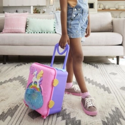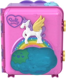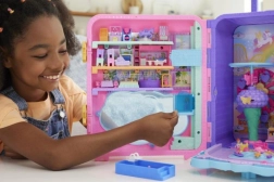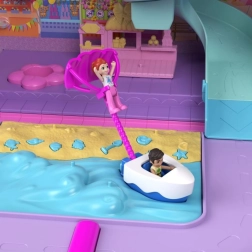 Ovaj šareni kofer POLLY POCKET Pollyville Resort Roll Away u trenu se otvara u tri kata puna zabave: hotelski lobby s dizalom, soba s kadom, ukusni buffet, arkadne igre i vanjski dio s plažom. Pokretni elementi i aktivacije preko ležećeg policajca pokreću atrakcije – čekaju te parasailing, let helikopterom, spiralni tobogan i panoramski kotač.