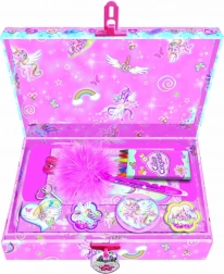 Ovaj čarobni set spaja zabavu i red: djeca mogu spremiti svoje tajne u zaključivu škrinjicu za nakit te pisati pisma ili poruke u dopisnom setu. Nježni motiv jednoroga razveselit će sve ljubitelje čarobnih priča i pastelných boja.