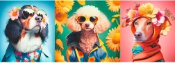 Tri stilski odjevena psa sa sunčanim naočalama i cvijećem na šarenoj pozadini stvaraju razigranu sliku koja će uljepšati svaki interijer.