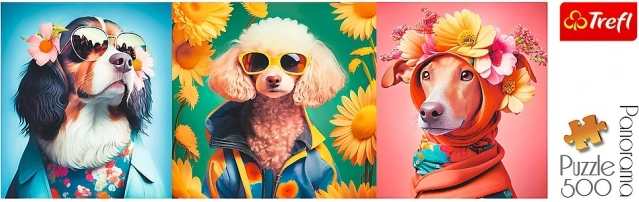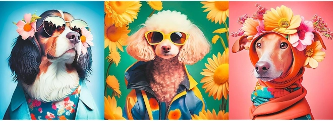 Otkrijte razigrani svijet pseće modne revije u živopisnim bojama i dojmljivom panoramskom formatu. Stilski odjeveni psi sa sunčanim naočalama i cvijećem pretvaraju slaganje u zabavno iskustvo, a gotova slika postaje originalna dekoracija.
