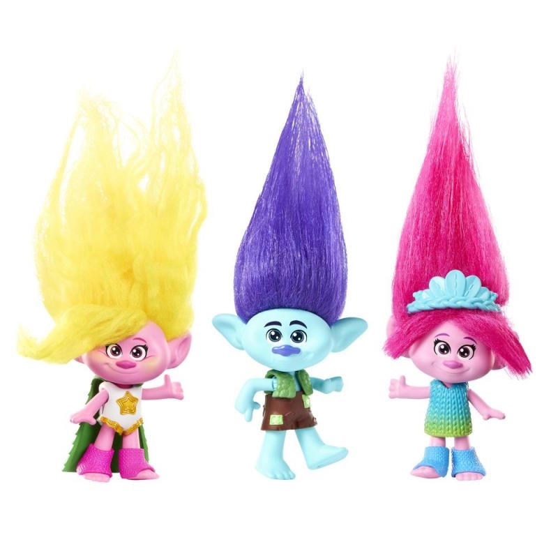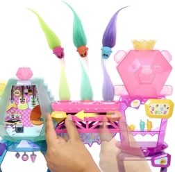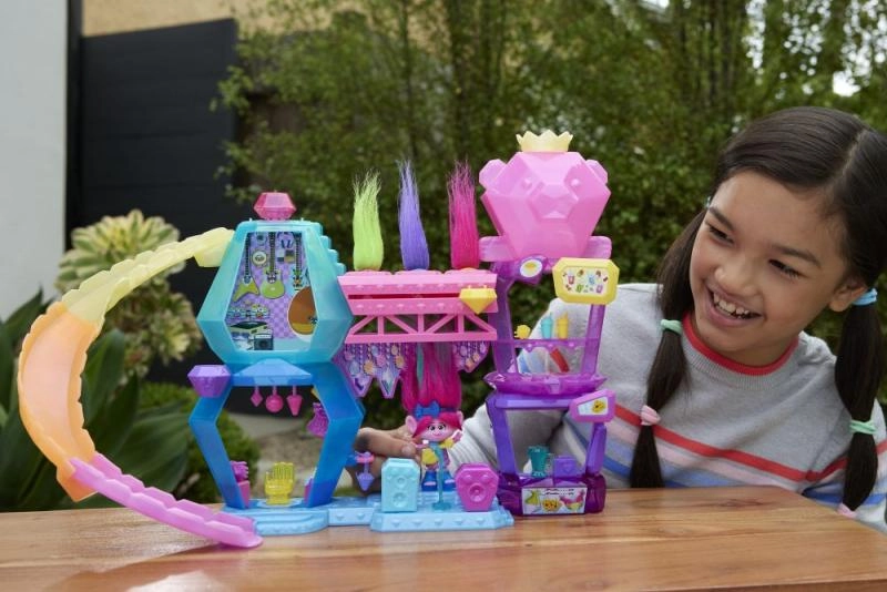 Otkrijte kultno okruženje iz filma TROLLOVI BAND TOGETHER u razigrano šarenom setu Mount Rageous. Djeca mogu stilizirati Poppyinu dugu kosu, skrivati sitnice u Hair Pops, priređivati koncerte na pozornici i spuštati se toboganom između katova. Više od 25 modnih i pripovjednih dodataka (mikrofon, vješalica, gitara s „draguljem” i drugi) potiče maštu i ulogu kraljice Poppy.