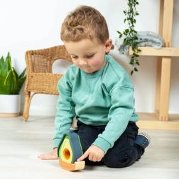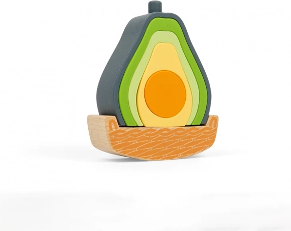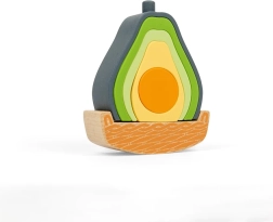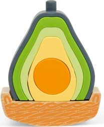 Igraći set u obliku avokada spaja drvo s prehrambenim silikonom za sigurno i zabavno učenje. Djeca mogu dijelove slagati, razvrstavati i pustiti avokado da se nješe na drvenoj podlozi. Pet silikonskih dijelova je mekano, izdržljivo i odlično služi kao taktilna/osjetilna igračka. Materijali su netoksični, silikon se može prati u perilici posuđa, a drveni dijelovi nose FSC certifikat.