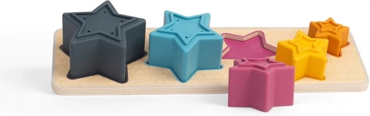Ova pametna edukativna igračka spaja drvenu bazu s pet šarenih silikonskih zvjezdica. Svaka zvjezdica ima različit broj otvora, pa pri igri s vodom stvara zabavan efekt malih vodoskoka. Djeca vježbaju koordinaciju ruka–oko, razvrstavanje po veličini i boji te logičko razmišljanje.