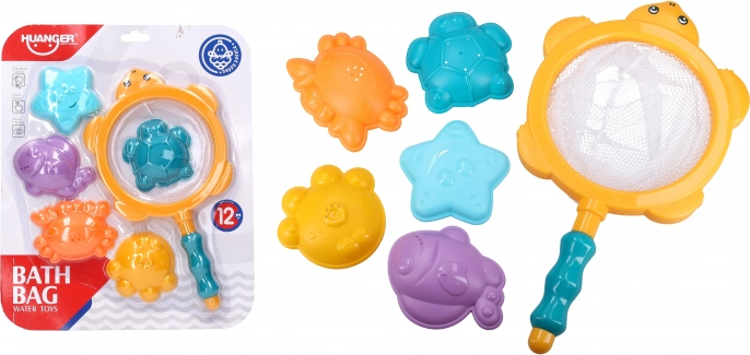 Zabavan set za kadu: 5 životinjskih kalupića s odvodom i mrežica za lovljenje (28 cm). Potiče motoriku i pretvara kupanje u igru. Idealno za kadu i bazenčić.