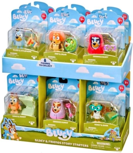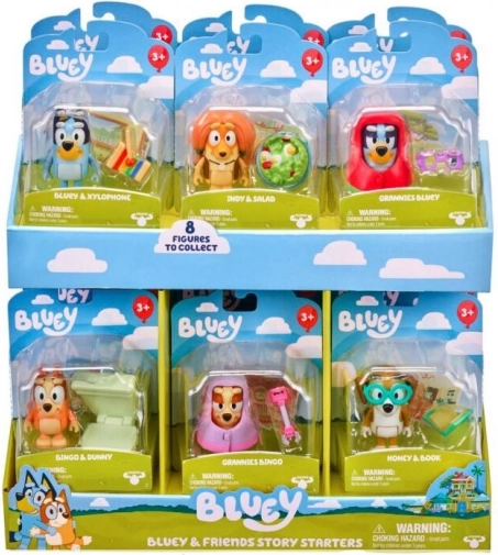 Uronite u svijet Bluey i pridružite se njezinim avanturama s prijateljima kao što su Bingo, Honey, Snickers, Indy i Muffin. Svaki set "Početak igre" tematski je povezan s epizodama serije Bluey i sadrži dodatke za svaki lik. U svakom pakiranju nalazi se i preslatka mini razglednica s motivom iz serije.