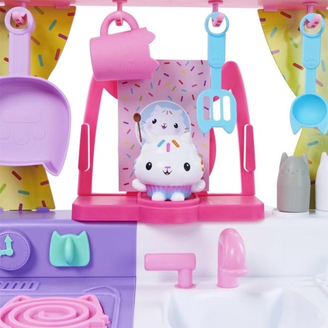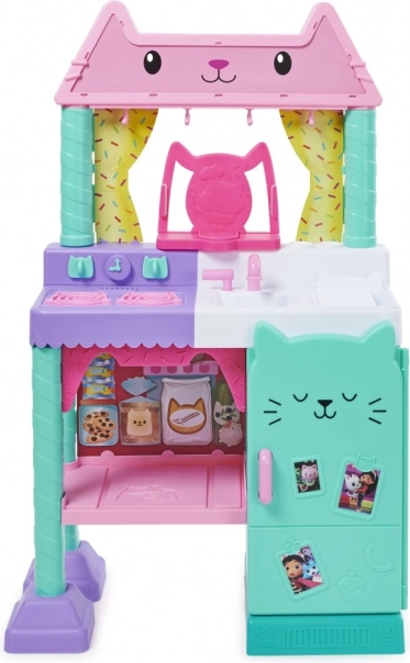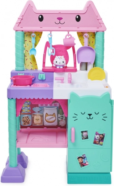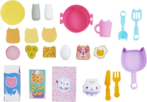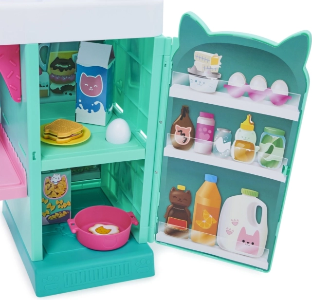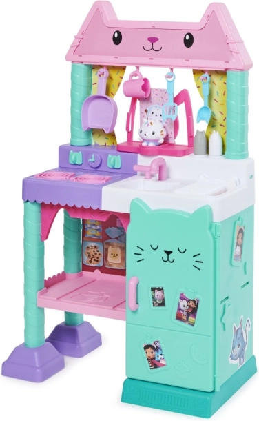 Predstavljamo dječji kuhinjski set Cakey Cat Kitchen iz svijeta Gabinina čarobnog domka. Ova igraća kuhinjica izvrstan je dodatak liniji igračaka iz serije Gabinin čarobni domek za djevojčice i dječake, s više od 20 kuhinjskih dodataka i visinom većom od 91 cm. Dortákova kuhinja opremljena je štednjakom, sudoperom s ocjeđivačem, 10 kuhinjskih dodataka i posuđem, kukama iznad prozora, 9 namirnica za igru te hladnjakom s fotografijama Gabine i njezinih mačkica, u koji možete spremati igraće namirnice, dodatke i druge igračke. Prekrasna kuhinjica također sadrži veliku figuricu mačka Dortáka s posebnim stalkom koji se može pričvrstiti na prozor kako bi Dorták mogao promatrati vaše kulinarske kreacije. Pritisnite gumb na Dortákovu stalku i okrenite gumbe štednjaka kako biste aktivirali više od 20 zvukova i fraza, 9 zvučnih efekata kuhanja, 3 glazbena broja i 11 Dortákovih izreka iz omiljene Netflixove serije Gabinin čarobni domek. Ako želite svoju malu kuhinjicu još malo proširiti, ispod štednjaka nalazi se polica posebno dizajnirana za pećnicu Bakey with Cakey Oven (prodaje se zasebno). Dortákov kuhinjski igraći set nezaobilazan je dodatak za sve obožavatelje Gabinina čarobnog domka, uz koji mogu ponovno doživjeti scene iz svojih omiljenih kulinarskih emisija ili pripremati vlastite kuharske kreacije za obitelj i prijatelje.