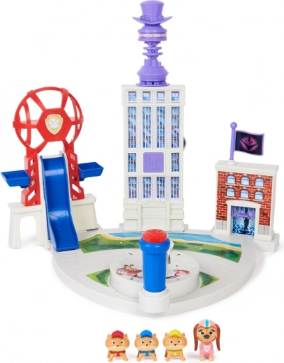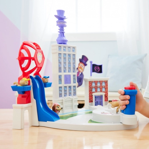 Pripremite se za spašavanje Adventure Cityja s Liberty i Mladim šapicama! Gradonačelnik Humdinger i Vee nešto smišljaju, a na Liberty i Mladim šapicama je da ih zaustave! Ovaj set uključuje minijaturni toranj PAW Patrola i razne mete na obzoru Adventure Cityja. Na vama je da uz pomoć svog vjernog lansera štenaca iz Mladih šapica zaustavite Veeja i gradonačelnika Humdingera i spasite situaciju! Počnite tako da postavite jednog od članova Mladih šapica na startnu platformu. Kada je spreman, povucite i okrenite katapult štenaca lijevo i desno te naciljajte na 3 unaprijed određena mjesta! Pritiskom crvenog gumba na dršci lansera ispalite jednog od štenaca prema ogromnoj ikoni cilindra na najvišoj zgradi – tada će se pojaviti veliki prikaz gradonačelnika Humdingera. U tom trenutku ispalite drugo štene kako biste ga srušili s puta! Nakon što završite prvi dio, postavite treće štene u lanser, naciljajte vrh zgrade sasvim desno i pokušajte ga pogoditi kako biste oborili vrata zatvorske ćelije ispred zgrade i zarobili Veeja! Dovršite sva tri dijela i spasite situaciju! Zabava je zajamčena! Ovaj zabavni igraći set sadrži i veliku tobogansku rampu ispred Tornja PAW Patrola, baš kao u filmu, kao i kontrolnu sobu i nekoliko prostora za igru gdje možete ponovno odglumiti svoje omiljene scene iz filma PAW Patrol: The Mighty Movie! Uz igračke iz svijeta PAW Patrola dijete može razvijati maštu i motoričke vještine te istodobno proživljavati omiljene prizore iz filma! Za još zabavnije i uzbudljivije misije nadahnute serijom PAW Patrol, sakupite sve igračke iz filmova o PAW Patrolu, poput nevjerojatnog zapovjednog zrakoplovnog nosača, te sve igračke iz posebnih izdanja PAW Patrola za djevojčice i dječake, kao što su figurice i igraći setovi Mighty Pups, Aqua Pups i Big Truck Pups (svaki se prodaje zasebno). Uživajte u beskrajnim avanturama s igraćim setom Liberty i Mlade šapice iz filma PAW Patrol: The Mighty Movie!