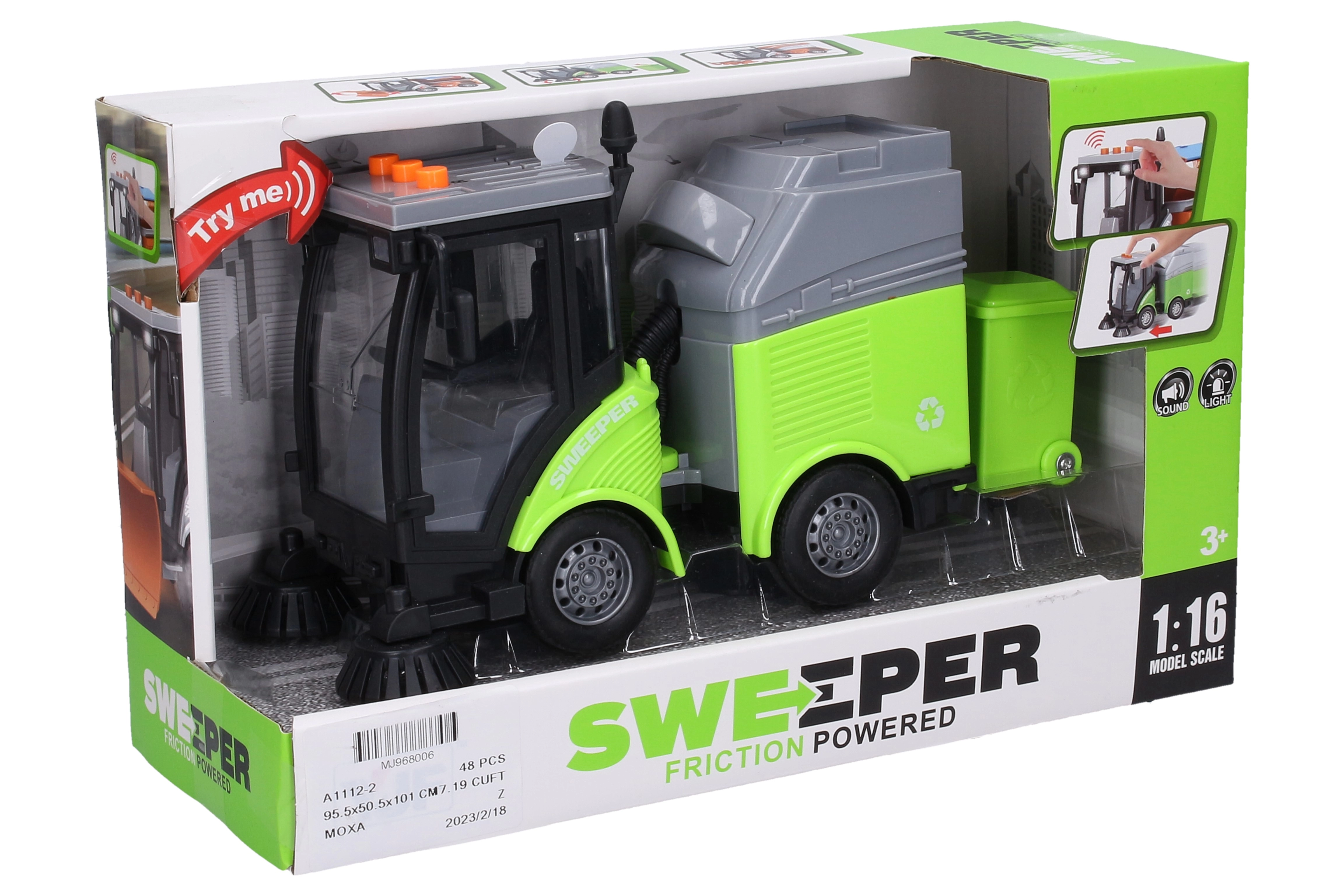 Zabavno i realistično vozilo za čišćenje s kantom duljine 24 cm za sve male zaljubljenike u tehniku. Zahvaljujući zamahnom mehanizmu vožnja je glatka i jednostavna, a atmosferu stvaraju svjetlosni i zvučni efekti aktivirani tipkama na kabini – paljenje, truba i vožnja unatrag. Baterije 3× AG13 su uključene u pakiranje, pa zabava može početi odmah.