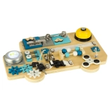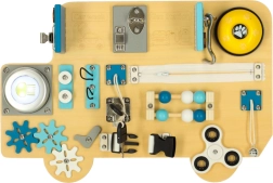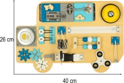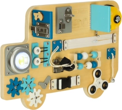 Senzorna ploča u obliku autobusa oduševit će sve male ljubitelje prijevoznih sredstava. Drveni detalji s automobilskom tematikom, skrivenim slikama praonice i benzinske postaje te pokretnim elementima potiču znatiželju i uče djecu principima uzroka i posljedice.