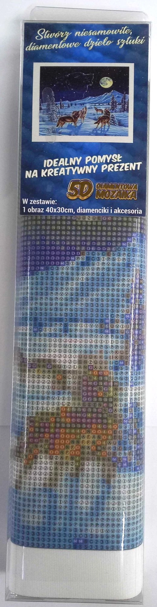 Dijamantno slikanje izvrstan je način kako se opustiti i istodobno stvoriti efektan ukras za interijer. Motiv Vučjeg čopora ističe se zahvaljujući sjajnim kamenčićima koji na platnu stvaraju mozaik efekt. Set je prikladan za početnike i napredne – dovoljno je lijepiti kamenčić po kamenčić na označena mjesta.