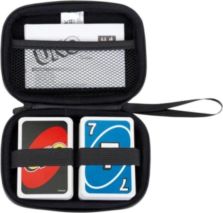 Putna torbica uključuje unutarnji mrežasti džep za UNO upute i dvije unutarnje elastične trake za pričvršćivanje karata.