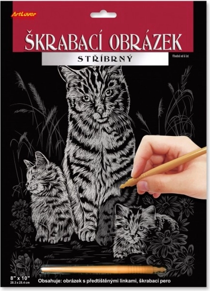 Otkrijte ARTLOVER strugalicu s motivom mačke s mačićima koja nakon grebanja otkriva srebrni efekt. Dimenzije 20 × 25 cm, u pakiranju plastična olovka za grebanje (14 cm). Sjajna kreativna zabava od 6 godina i poticaj za finu motoriku.
