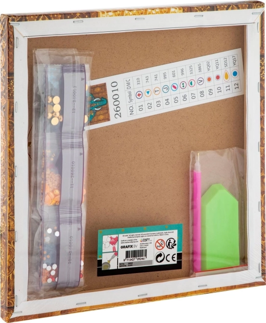 - Aplikacijska olovka, posudica, vosak, set šarenih kamenčića, platno s tiskom na okviru