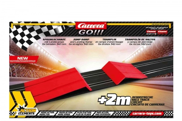 Proširite svoj svijet autodroma s skakaonicom za CARRERA GO!!! u mjerilu 1:43. Dobijte više akcije, dulju stazu i napetije utrke zahvaljujući rampi za odraz, rampi za slijetanje i 6 ravnih segmenata duljine 342 mm – ukupno do +2 metra staze. Kompatibilno i s CARRERA DIGITAL 143.