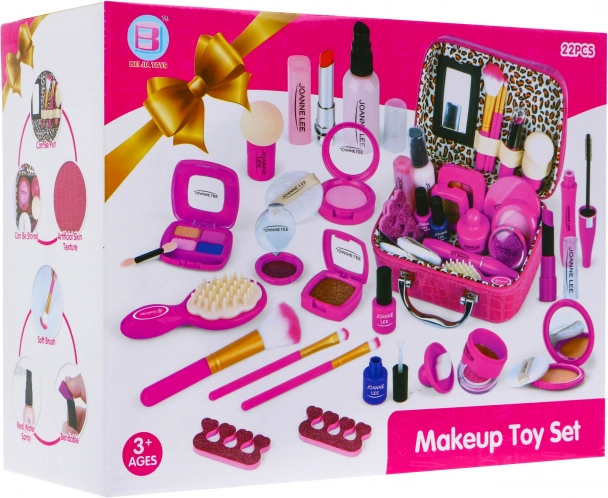 Set s torbicom napunjenom do vrha sigurnim dodacima za šminkanje igračka je za djecu od 3 godine. Elegantan i veliki kofer izrađen je od mekane eko kože. Ima udobnu ručku, četiri nožice na dnu i unutarnje zrcalo. Zatvara se patentnim zatvaračem. Cijeli set sastoji se od 22 stavke,sadrži kozmetiku poput sjenila, šljokica, ruževa, laka za nokte, maskare i mnogo toga. Kozmetika je atrapa, ali izgleda realistično, ne troši se i dječja koža bit će sigurna. Igra s kozmetikom razvija kreativno razmišljanje, vježba maštu, potiče koncentraciju. | |