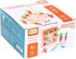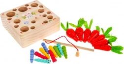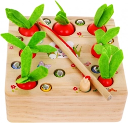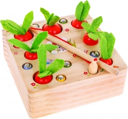 Drvena igra s mrkvicama je dizajnirana kako bi potaknula radoznalost i podržala razvoj fine motorike te koordinacije ruku i očiju. Djeca se mogu naučiti prepoznavati oblike i boje te također poboljšati svoje vještine s magnetnom udicom. Ova igra je idealna za samostalnu igru ili igru u grupi. Uz pomoć magnetne udice djeca moraju ukloniti sve crviće, a zatim sakupiti mrkve kako bi zaštitila rastuće povrće.