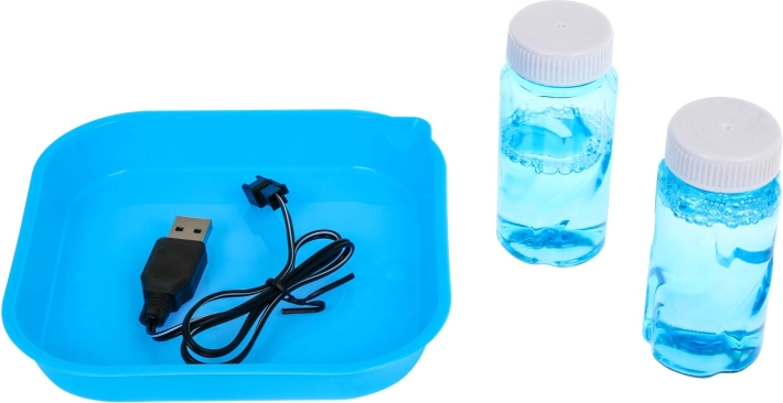 - Puhalica mjehurića, 2× tekućina za mjehuriće, baterija 3,7 V, naljepnice, traka, USB kabel, zdjelica za tekućinu