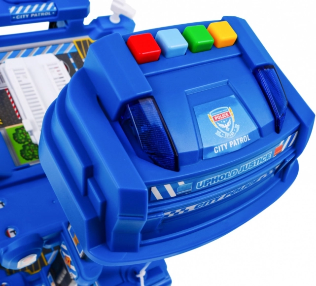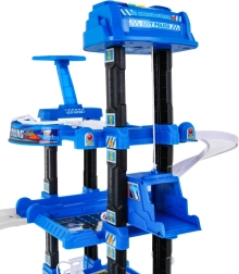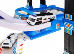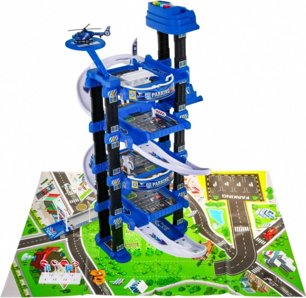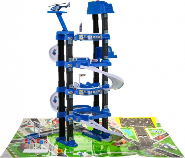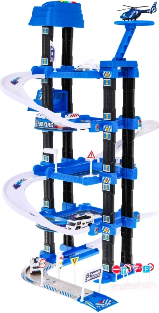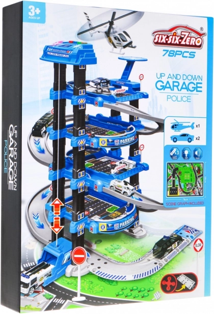 Ova robusna, višekatna policijska parkirna garaža spaja zabavnu vožnju po rampama s funkcionalnim dizalom koje se kreće gore i dolje, uz bljeskajuća svjetla i zvučne efekte (napajanje 3× AA, nisu uključene). Na gornjoj razini nalazi se heliport, a niže razine nude parkirna mjesta i prolaze.