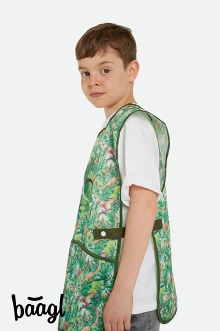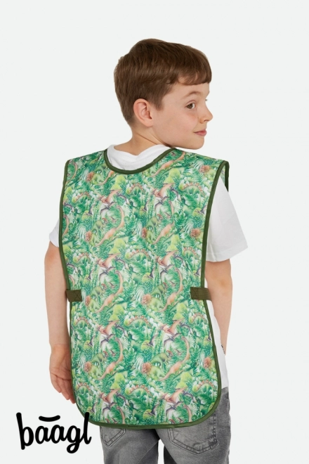 Ova pregača privlači svojom šarenom grafikom koja uključuje zabavan motiv dinosaura i džungle.
