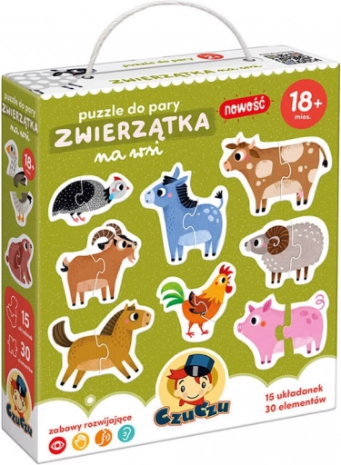 Prve edukativne puzzle za najmlađe: CzuCzu dvodijelne puzzle sa životinjama s farme razvijaju finu motoriku, koncentraciju i zapažanje. U pakiranju ćete pronaći 15 slatkih životinja, svaka sastavljena od 2 velika dijela idealna za male dječje ruke. Sjajan izbor za poklon i prvo upoznavanje sa svijetom puzzli.