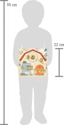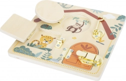 Ova kvalitetna drvena motorička ploča u obliku kućice donosi djeci od 3 godine sigurni izazov: otvori, zatvori i ponovno otkrij. Različite vrste brava, zasuna i kopči uče praktičnim vještinama svakodnevnog života, dok zaigrani dizajn sa životinjama sa Safarija potiče znatiželju i koncentraciju.