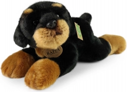 Slatki plišani pas Rottweiler u ležećem položaju, duljine 30 cm, razveselit će djecu i odrasle. Ima realistično izvođenje, vrlo kvalitetan mekani pliš i eco-friendly ispuna od recikliranih PET boca, koja je sigurna i za najmlađe.