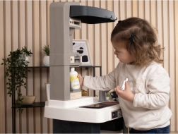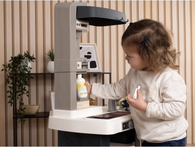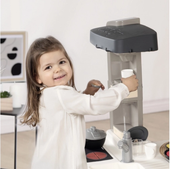 Elektronička kuhinjica Smoby mini Tefal Studio opremljena je zvučnim efektima koji pojačavaju realističan dojam igre. Sadrži štednjak s plohom za kuhanje, napu, pećnicu, hladnjak, aparat za kavu s kapsulama, aparat za gaziranje i tavu.