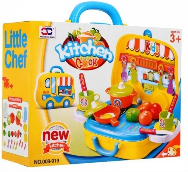 Ova simpatična kuhinjica u obliku autića idealna je za male kuhare. Praktični kofer s ručkom i kotačićima lako se prenosi, a nakon rasklapanja dobivate radnu površinu s imitacijom indukcijske ploče za kuhanje, odlagnim bočnim policama i vješalicom za pribor. U kompletu su posuđe, pribor za jelo i namirnice s kojima će djeca pripremiti svoj prvi “menu”.