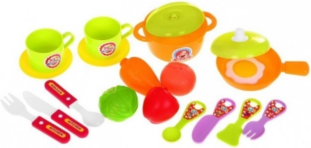 - Rasklopivi kofer–autić, radna ploha s imitacijom indukcijske ploče, 2 bočne police, vješalica za pribor, lonac s poklopcem, tava s poklopcem, 2 tanjurića, 2 čašice, 2 vilice (mala i velika), 2 žličice (mala i velika), 2 noža (mali i veliki), lopatica, slavina, 4 komada povrća/voća (paprika, mrkva, kupus, naranča), jaje na oko, šareno poklon pakiranje