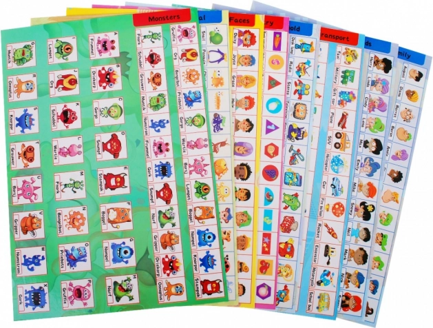 Ilustrirane kartice s kategorijama (lica, oblici, promet, obitelj, čudovišta) potiču razvoj rječnika, pažnje i sposobnosti stvaranja asocijacija.