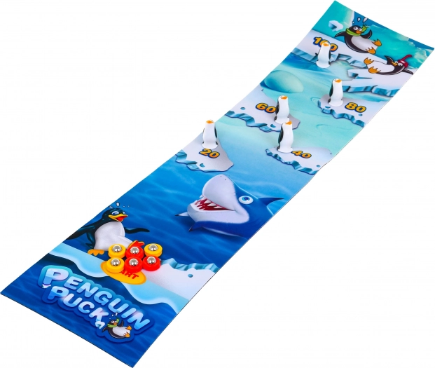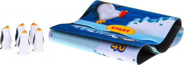Velika, jasno označena podloga s oznakom starta i numeriranim poljima za lako zbrajanje bodova. Motiv oceana s pingvinima i morskim psom pojačava atmosferu igre.