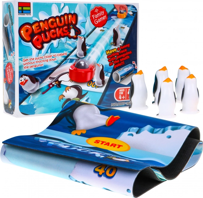 - protuklizna igrališna podloga, 5 pingvina, 6 pakova s metalnom kuglicom, priručnik