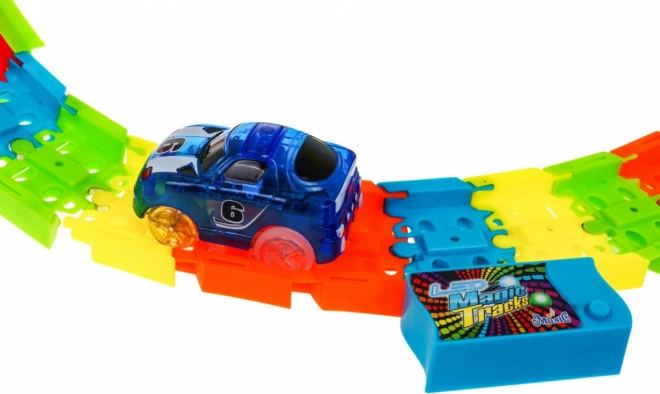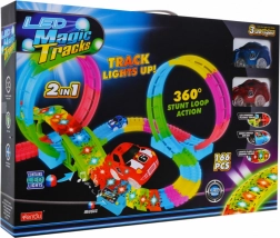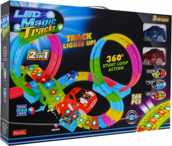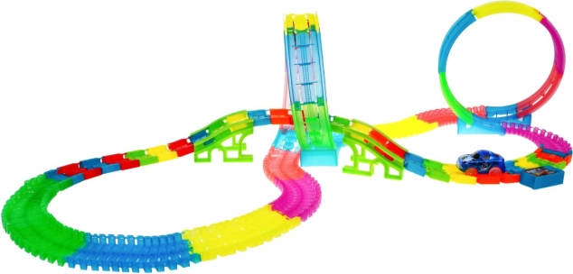 Zabavna i šarena trkaća staza s petljama i nagnutim dionicama nudi djeci od 3 godine sate akcijske igre. Zahvaljujući fluorescentnim segmentima svijetli u mraku, ima LED osvjetljenje, ugrađeni glazbeni panel i dva LED autića za efektne vožnje pune svjetlosnih tragova.