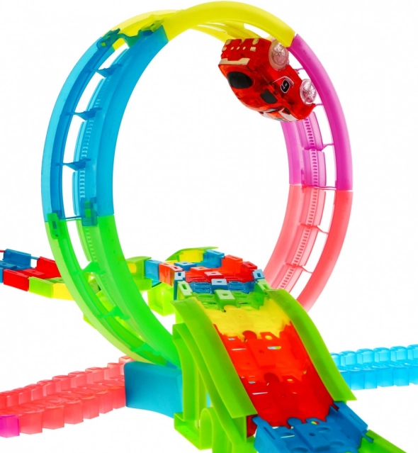 Svjetleća trkaća staza za djecu 3+ s LED autićima, petlje 360°, nagnute dionice, 166 dijelova