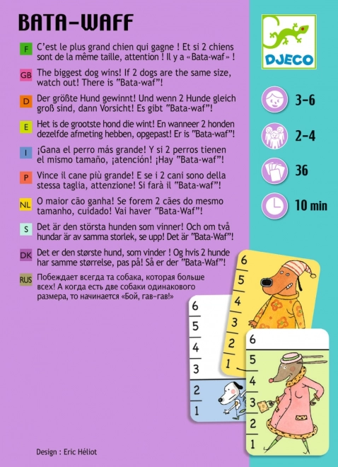 Igra DJECO Bata-Waf je zarazna i jednostavna kartaška zabava koja uči djecu uspoređivati veličine i pritom vježba opažanje. Svaki igrač okrene gornju kartu, a onaj tko ima većeg psa na karti uzima sve odigrane karte. Ako ispadne ista veličina, izgovara se čarobno „Bata Waf“ i slijedi odlučujuća runda s idućom kartom.