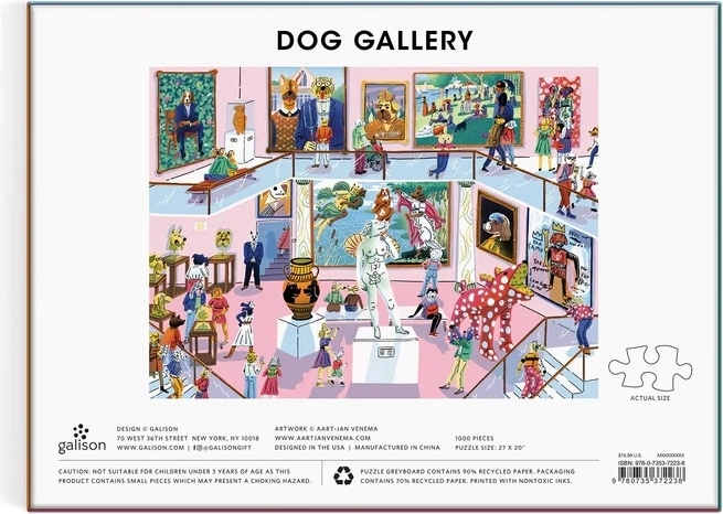 Slagalica Pseća Galerija donosi zabavnu ilustraciju Art-Janna Veneme koja prikazuje galeriju punu pasa koji obožavaju slavna umjetnička djela. Odlična je kao poklon i nudi kvalitetan tisak na recikliranom papiru.