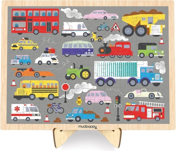 Otkrijte zabavu i učenje s drvenim puzzleom MUDPUPPY na temu prometnih sredstava. Set sadrži 100 čvrstih drvenih dijelova s prekrasnim ilustracijama automobila, teretnih vozila, autobusa i drugih, a dodatno i praktični drveni stalak za izlaganje gotove slike kao dekoracije.